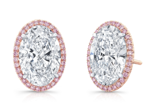 Tohn, nominated in the series, “Nobody Wants This,” wore a Rahaminov Diamonds 18k rose gold Bypass Ring with pear-cut diamonds (3.01 carats each) surrounded by fancy pink diamonds (0.25 ctw) and 18k platinum and rose gold Halo Studs with diamond ovals (3.25 and 3.01 carats each) surrounded by round fancy pink diamonds (0.30 ctw).