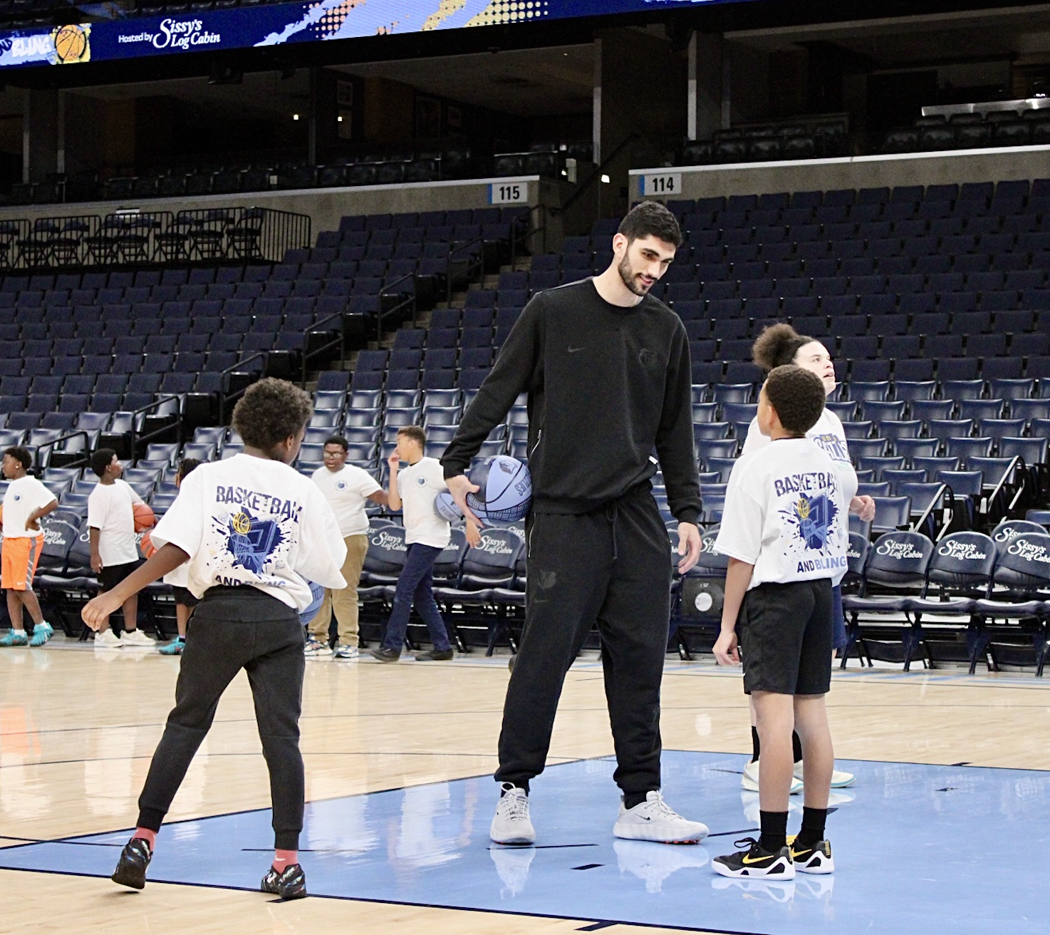 More than 30 students participated in interactive drills and skill sessions with Memphis Grizzlies players Santi Aldama and GG Jackson, along with Junior Grizzlies coaches, gaining hands-on instruction and a firsthand look at the discipline, preparation and teamwork that define professional basketball. The experience continued off the court with dinner in the Sissy’s Log Cabin Lounge, where participants received basketballs and commemorative Basketball and Bling t-shirts provided by Sissy’s Log Cabin.
